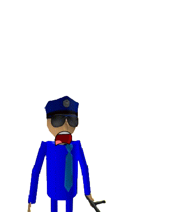 A low-poly Baldi-like police officer in a blue uniform and sunglasses stumbles while holding a gun.