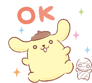 Pom Pom Purin jumps happily with Miikun, surrounded by sparkles, conveying an enthusiastic 'OK'. A cute and positive sticker.