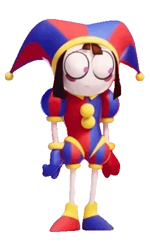 Pomni from The Amazing Digital Circus in her iconic jester costume, performing a subtle idle animation.