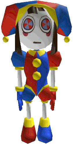 Pomni from The Amazing Digital Circus in her iconic jester costume, striking an 'up pose' with a subtle idle animation.