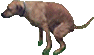 A pixel art animation of a brown dog squatting and pooping, creating a pile of feces. Humorous and direct.