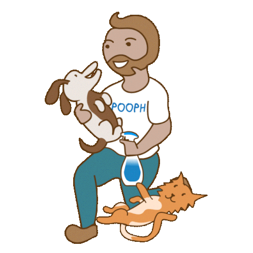 A happy man wearing a 'POOPH' shirt lovingly interacts with a dog and a cat, surrounded by hearts.