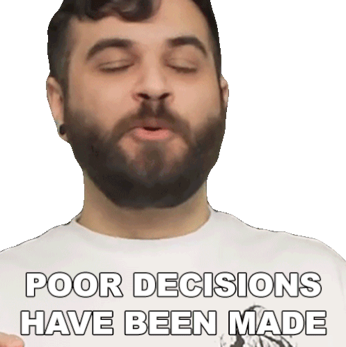 Andrew Baena, with a concerned expression, highlights the phrase 'Poor Decisions Have Been Made' on his shirt.