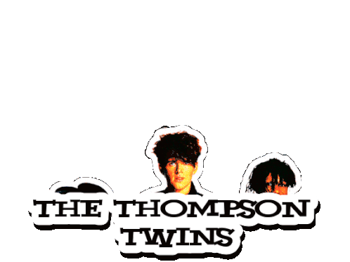 An animated sticker featuring the iconic 80s pop band The Thompson Twins, including Tom Bailey, Alannah Currie, and Joe Leeway.