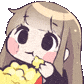 A cute anime-style chibi girl with long hair happily eats popcorn from a bucket, looking engaged.