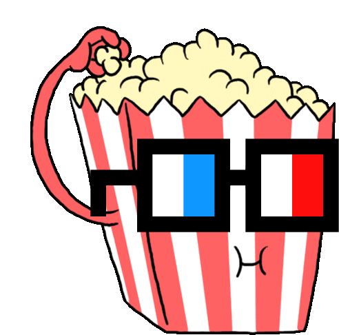 Cartoon popcorn bucket with French flag 3D glasses, eating popcorn, associated with Nouns Dao.