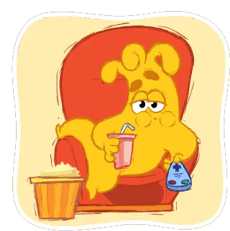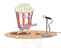 An animated popcorn bucket character wearing star sunglasses, playing a guitar and singing into a microphone like a rock star.