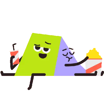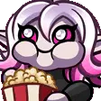 Cartoon girl with black hair happily eating popcorn from a bucket while sitting in a cinema seat.