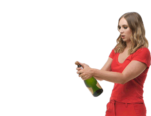 Olivia Lane pops a champagne bottle, looking surprised as the cork flies off, ready to celebrate.