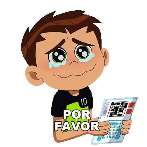 Ben 10 crying and then forcing a smile while holding a tablet and saying 'Por Favor' (Please).