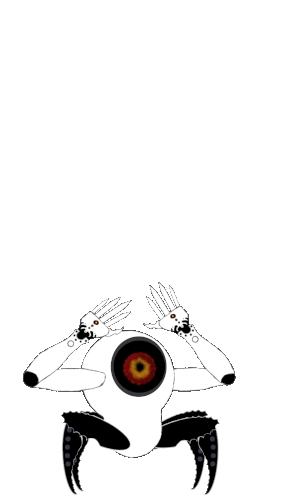 Portal Senpai robot, a white spherical bot with a single eye, jumps excitedly with its mechanical arms raised.