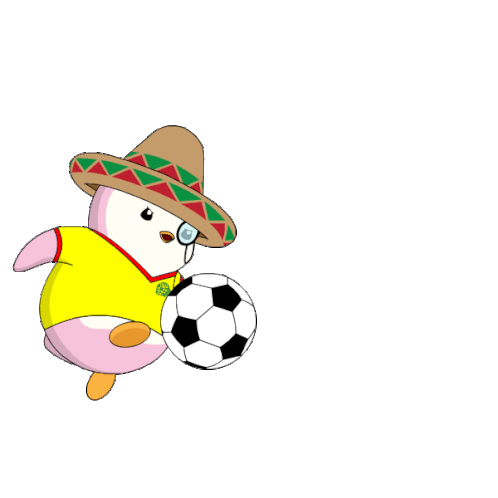A cute cartoon penguin wearing a sombrero and a yellow shirt kicks a soccer ball, celebrating Portugal's football spirit.
