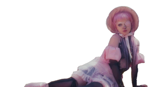 Jazmin Bean in a distinctive yandere pose, featuring pink hair, a straw hat, and an eye patch, lying on the ground.