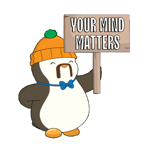 An animated Pudgy Penguin with a mustache holds a sign saying "YOUR MIND MATTERS," promoting mental health.