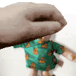 A hand holds a cute plush toy, possibly a character or item from the 'Postal' video game series, wearing a green shirt.
