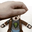 Chibi pixel art sticker of a hand holding a Postal Dude plushie with a green leaf.