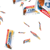 Postcode Loterij tickets with various prize amounts like €1,000, €20,000, and €75,000 fall like money rain, symbolizing winning.
