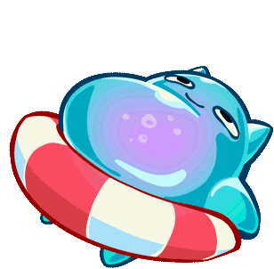 A relaxed Postknight blob character floats in a red and white inner tube, looking content and full after a meal.