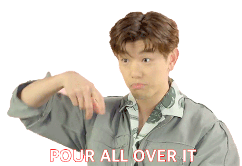 Eric Nam makes a funny face and a pouring hand gesture while saying 'Pour All Over It'.