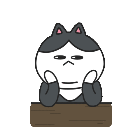 A cute cartoon cat with black and white fur rests its head on its paws, displaying a grumpy, pouting, and unamused expression.