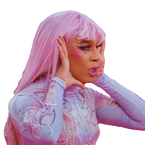 Soa De Muse from RuPaul's Drag Race makes a playful pouting face with hands framing her face.