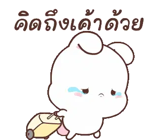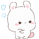 A cute white cartoon bunny with pink ears and nose sits with a pouty, sad expression, showing frustration.