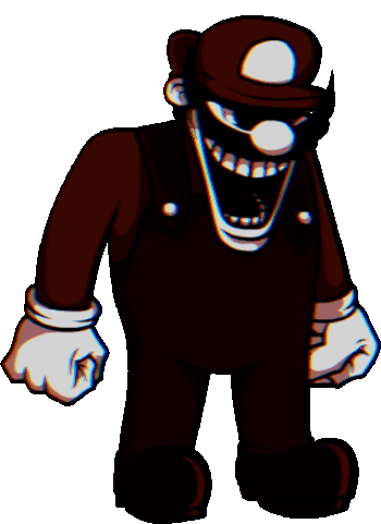 A creepy, distorted Mario character in a 'Power Down Idle' state, featuring sharp teeth and glowing eyes.