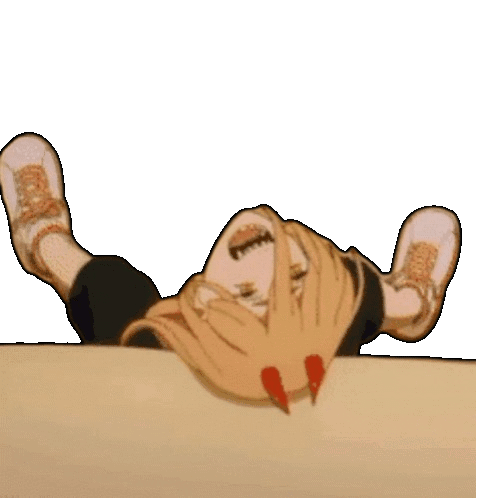 Power from Chainsaw Man laughing joyfully while lying on her back with legs crossed, a fun animated sticker.