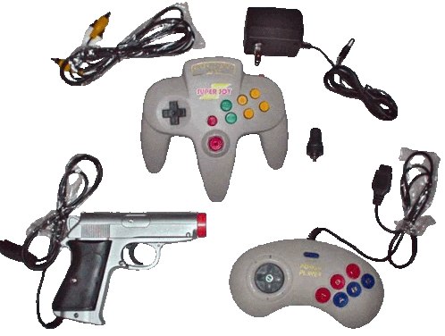 a super boy video game controller is surrounded by wires and a toy gun