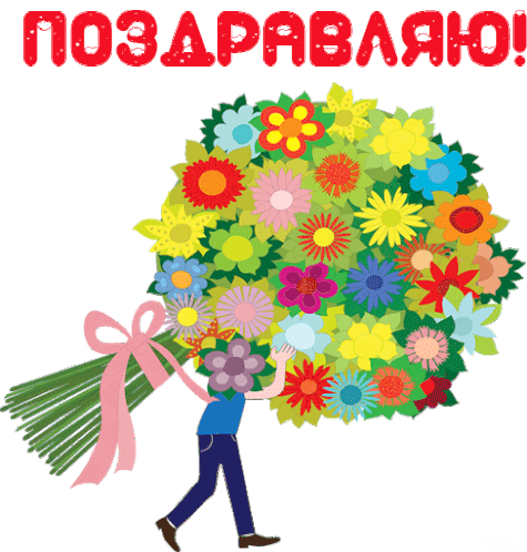 a man is carrying a large bouquet of flowers with the words поздравляю written on the bottom