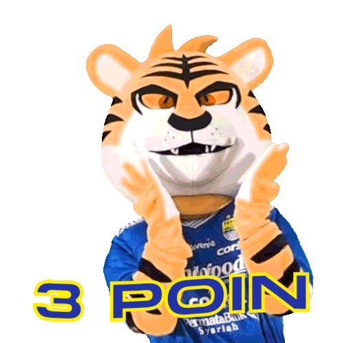 Prabu Persib, the cute tiger mascot, celebrates a win with a playful dance and "3 Poin" message.