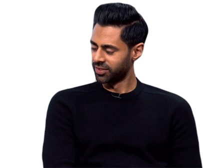 Hasan Minhaj brings his hands together in a hopeful praying gesture, with a glowing prayer emoji appearing.