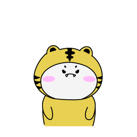 An adorable, chubby character in a yellow tiger costume raises its arms and roars playfully, surrounded by sparkles.