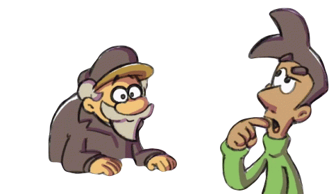 A cartoon sticker featuring an older man explaining something to a younger man who appears confused or thoughtful, indicating a question or doubt.
