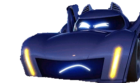 A cartoon Batmobile character, Bam, looking worried and shocked with glowing blue and yellow lights.