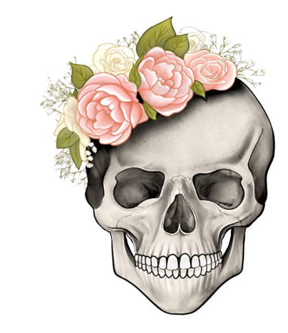 A stylized skull wearing a beautiful flower crown, with the text 'HA HA' appearing, conveying a humorous or lighthearted mood.