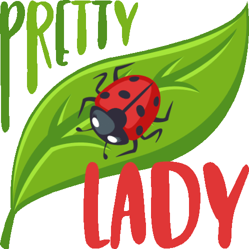 a ladybug sits on a green leaf with the words " pretty lady " above it