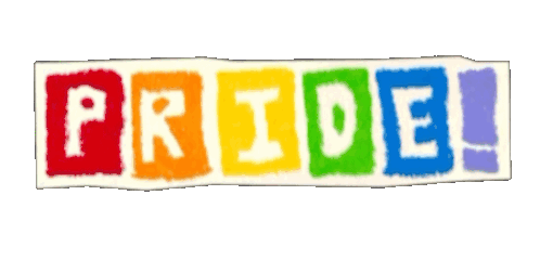 The word 'PRIDE!' displayed in vibrant rainbow colors, with each letter a distinct hue, celebrating gay pride.