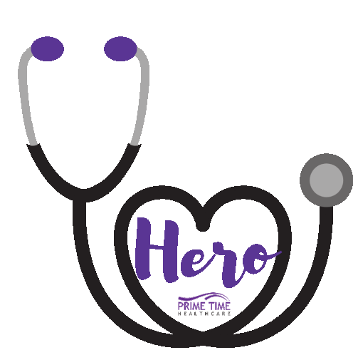 A supportive sticker featuring a stethoscope forming a heart, with 'Hero' and 'Prime Time Healthcare' inside, honoring healthcare heroes.