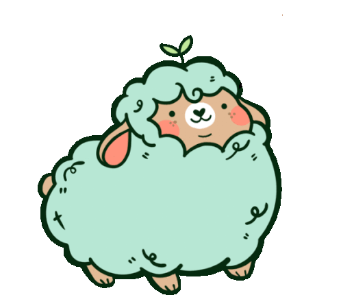 A cute, fluffy, light green Chonkthesheep sheep from Prince Of Pins wiggles its body, featuring a heart-shaped nose and a sprout on its head.