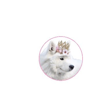Adorable white dog, Princess August A, wearing a golden and floral crown, looking regal and cute.