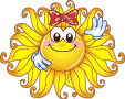 A cheerful cartoon sun with a red bow on its head waves hello, radiating warmth and friendliness with a bright smile.