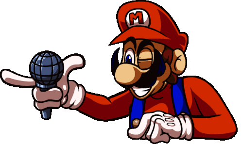 Mario from Nintendo Mania enthusiastically holds a microphone and points, promoting the FNF game.