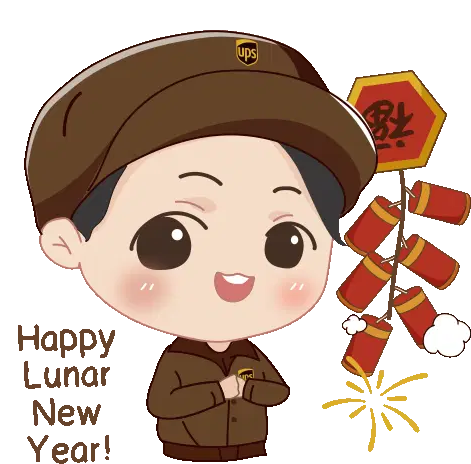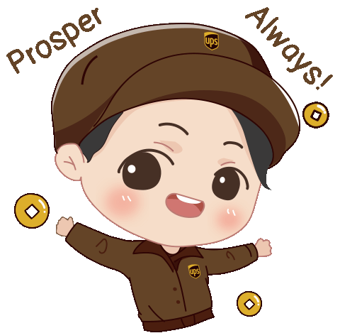 A cheerful UPS character wishes 'Prosper Always!' amidst gold coins and ingots, celebrating Chinese New Year.