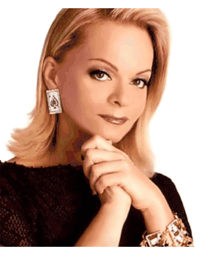a woman wearing a black top and earrings has her hand on her chin