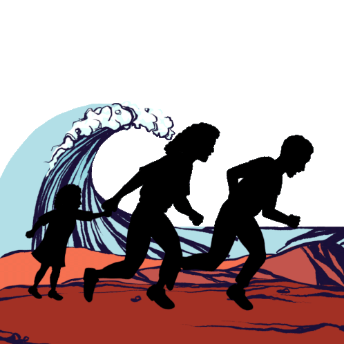 A family, including a child, runs from a massive wave, symbolizing the plight of Haitian climate refugees seeking safety.