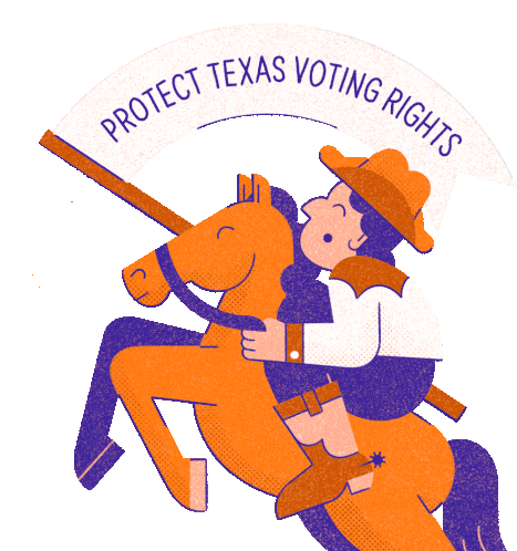 A cowboy on a horse holds a banner that reads "Protect Texas Voting Rights," advocating for voting rights in Texas.