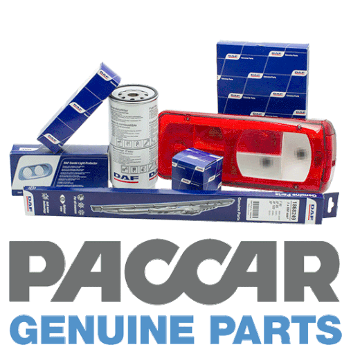 Paccar Genuine Parts logo displayed with a range of truck components like a turbocharger, battery, and filters.