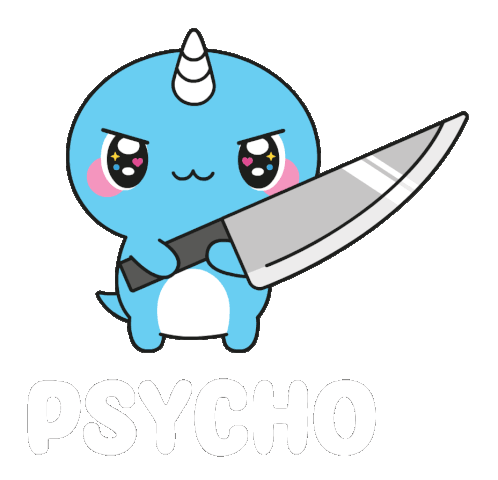 A cute, blue narwhal character with sparkly eyes holds a large knife, with the word 'PSYCHO' displayed below, conveying a 'cute but dangerous' vibe.