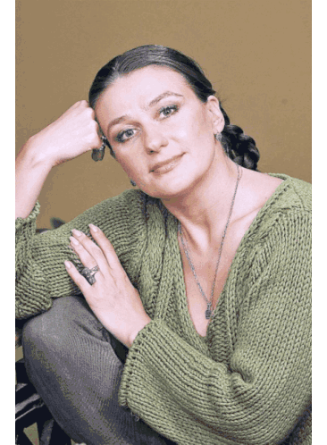 a woman wearing a green sweater and a silver ring on her finger